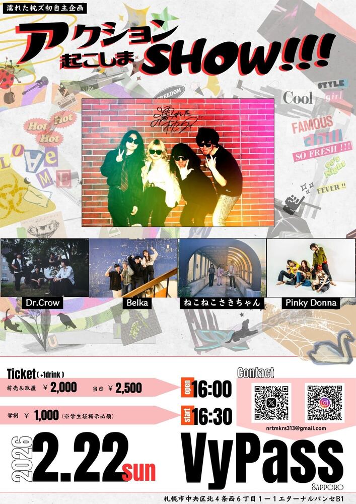 濡れた枕ズ初自主企画「アクション起こしまSHOW!!!」 SCHEDULE 2026/02/22(日) 札幌VyPass. 地図を表示 16:00/16:30 Pinky Donna / 濡れた枕ズ / ねこねこさきちゃん / Belka / Dr.Crow 前売&取り置き\2,000 / 当日\2,500 / 学割\1,000 URLをコピーする 報告する