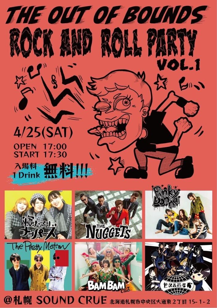 THE OUT OF BOUNDS 「ROCK AND ROLL PARTY Vol.1」 SCHEDULE 2026/04/25(土) 札幌SOUND CRUE 地図を表示 17:00/17:30 Pinky Donna / THE NUGGETS / 寝たふりナッパーズ / 世紀末覇者's / BAM BAM club / The Pretty Motion 本公演はFREE LIVEになります。 URLをコピーする 報告する