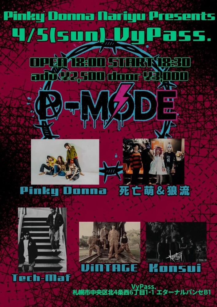なりゆpresents.「P-MODE」 SCHEDULE 2026/04/05(日) 札幌VyPass. 地図を表示 18:00/18:30 Pinky Donna / 死亡萌&狼流 / ViNTAGE / Konsui / Tech-Maf(DJ) 前売\2,500 / 当日&取り置き\3,000 Livepocket URLをコピーする 報告する